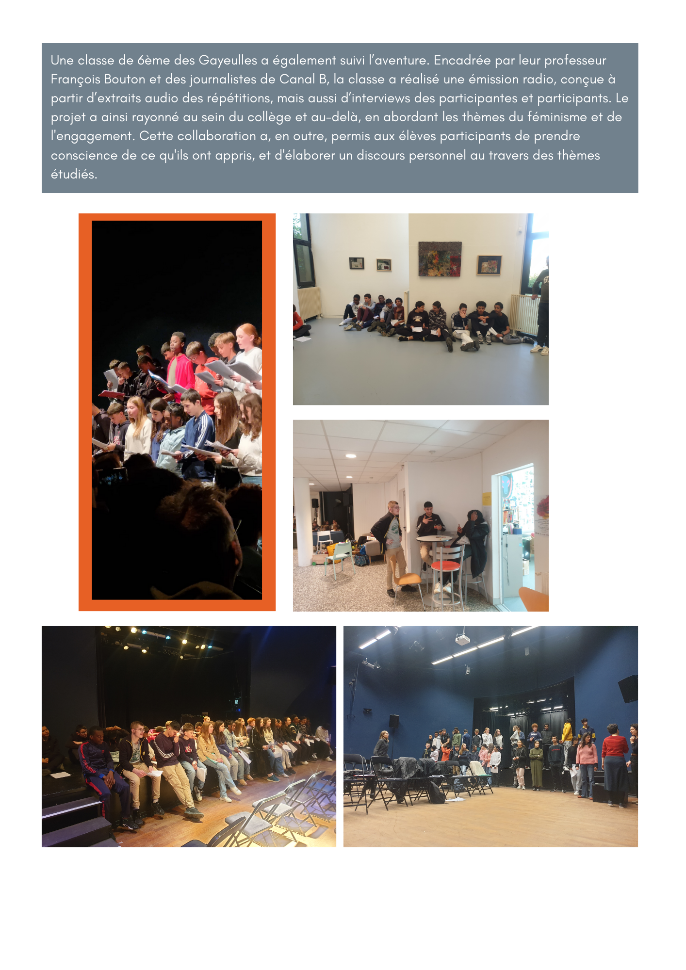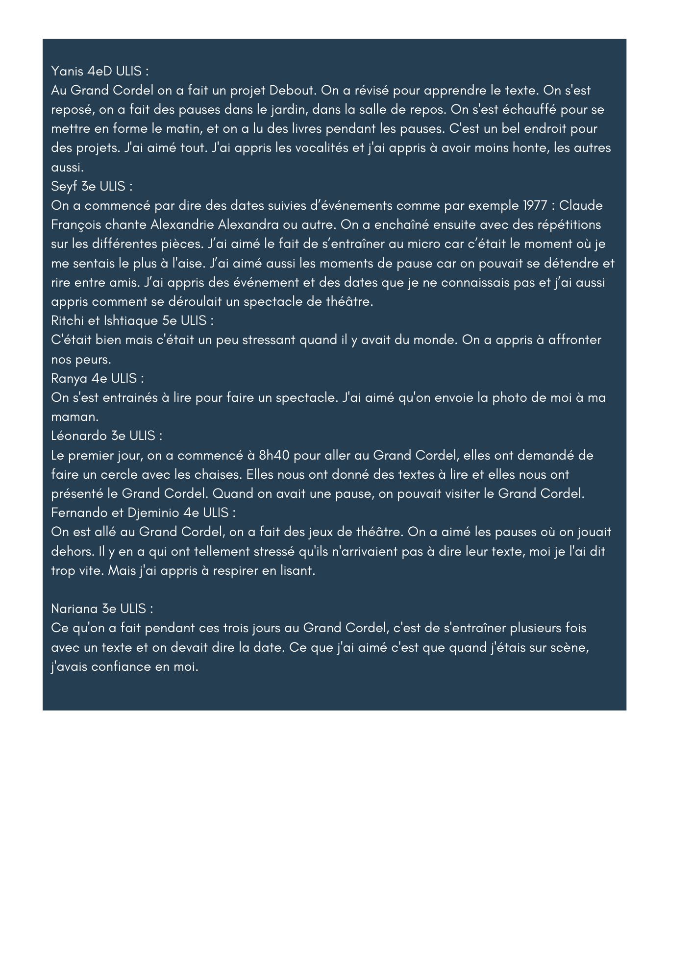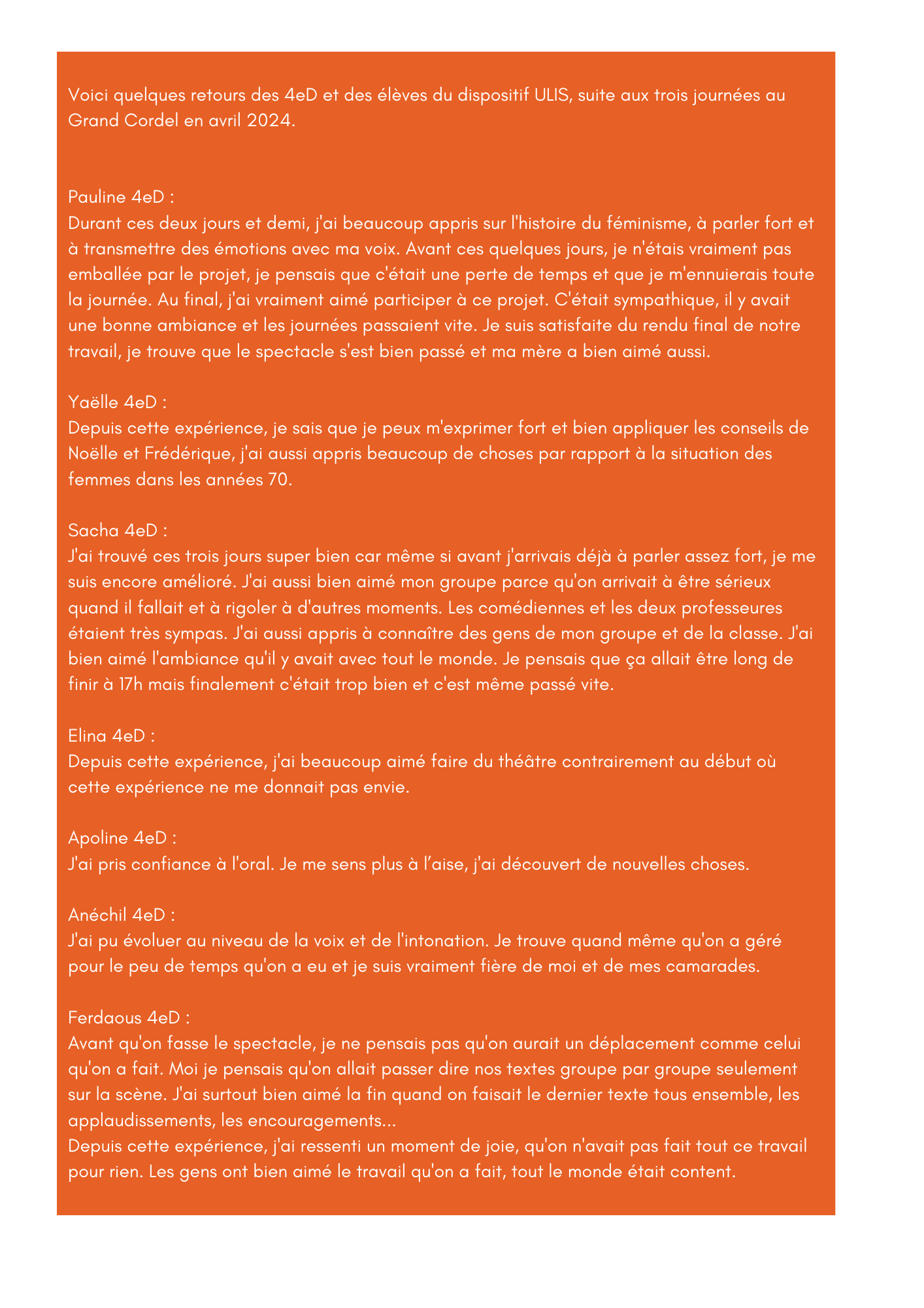 Projet DEBOUT au Grand Cordel avec la classe de 4e D et le dispositif ULIS