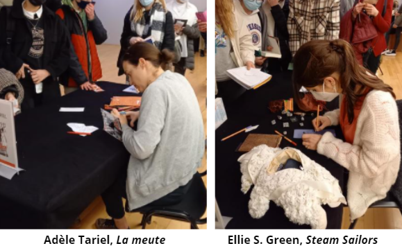 « La suite de cette journée nous a finalement emmenés aux Champs-Libres, pour une rencontre auteurs avec quelques 300 adolescents. On y a conduit évidemment Adèle Tariel et retrouvé Ellie S. Green, autrice de la saga steampunk fantastique Steam Sailors. On s’est confronté ici au contraste entre l’ambiance très réaliste et pied-sur-terre qui entoure l’œuvre d’Adèle Tariel et l’imaginaire débordant, rempli de pirates, d’Alchimie et d’humour de Ellie S.Green. Deux univers qui semblent avoir tout autant touché l’un que l’autre les adolescents présents, qui n’ont pas manqué de questions et d’intérêt envers les œuvres et les autrices. »
