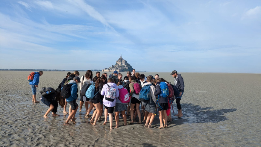 Heureusement, comme nous avons tous réussi à sortir du « Val sans Retour », nous avons pu, les jours suivants, visiter le célèbre Mont-Saint-Michel. Mais avant cela, nous sommes allés pieds nus dans la baie, où – accompagnés d’un guide – nous avons pu vivre de près le phénomène des sables mouvants. Ensuite, nous avons gravi les escaliers raides et les ruelles étroites jusqu’à l’abbaye, où nous avons appris beaucoup de choses sur l’histoire de la création du mont monastique, son utilisation comme prison dans le passé, ainsi que sur la vie des moines bénédictins.
